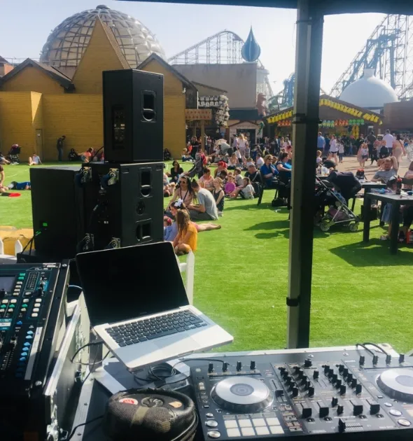 Multiple zones (stage, picnic area, kids’ zone) with independent level control.